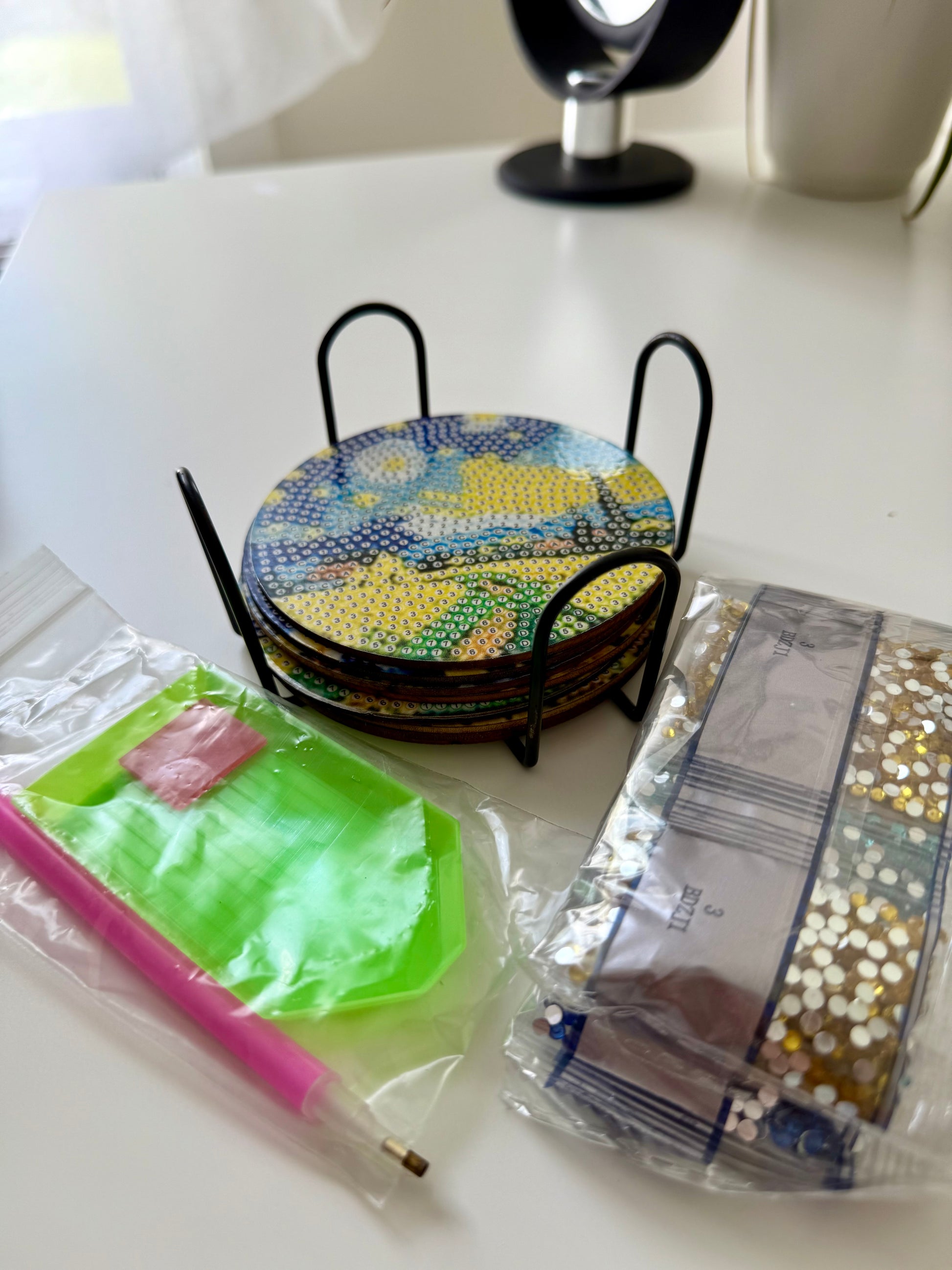 🎨 Stunning DIY diamond for coaster set inspired by Van Gogh’s famous landscapes and sunflowers. Includes 8 sparkling coasters, stand, and full tool kit.
